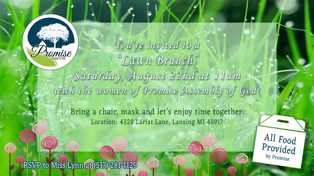 Description: You’re invited to a “Lawn Brunch” Saturday, August 22nd at 11am with the women of Promise Assembly of God! Bring a chair, mask and let’s enjoy time together.