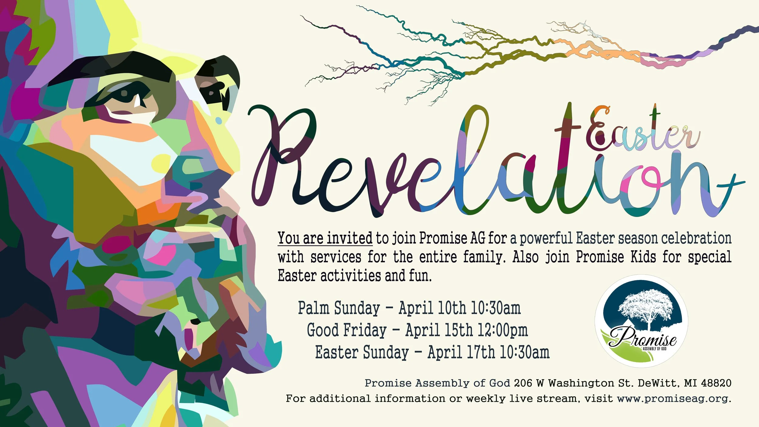Promise Assembly Easter Service will be shared through In-Person and Streaming. Please join us in-person at 206 W Washington St, DeWitt, MI 48820 or streaming at www.promiseag.org. Additional stream feed available at Promise AG Facebook https://www.facebook.com/pg/PromiseAssemblyofGod/. Stream will begin at 10:15am. Worship will begin at 10:30am. Invite a friend and come prepared to worship together.