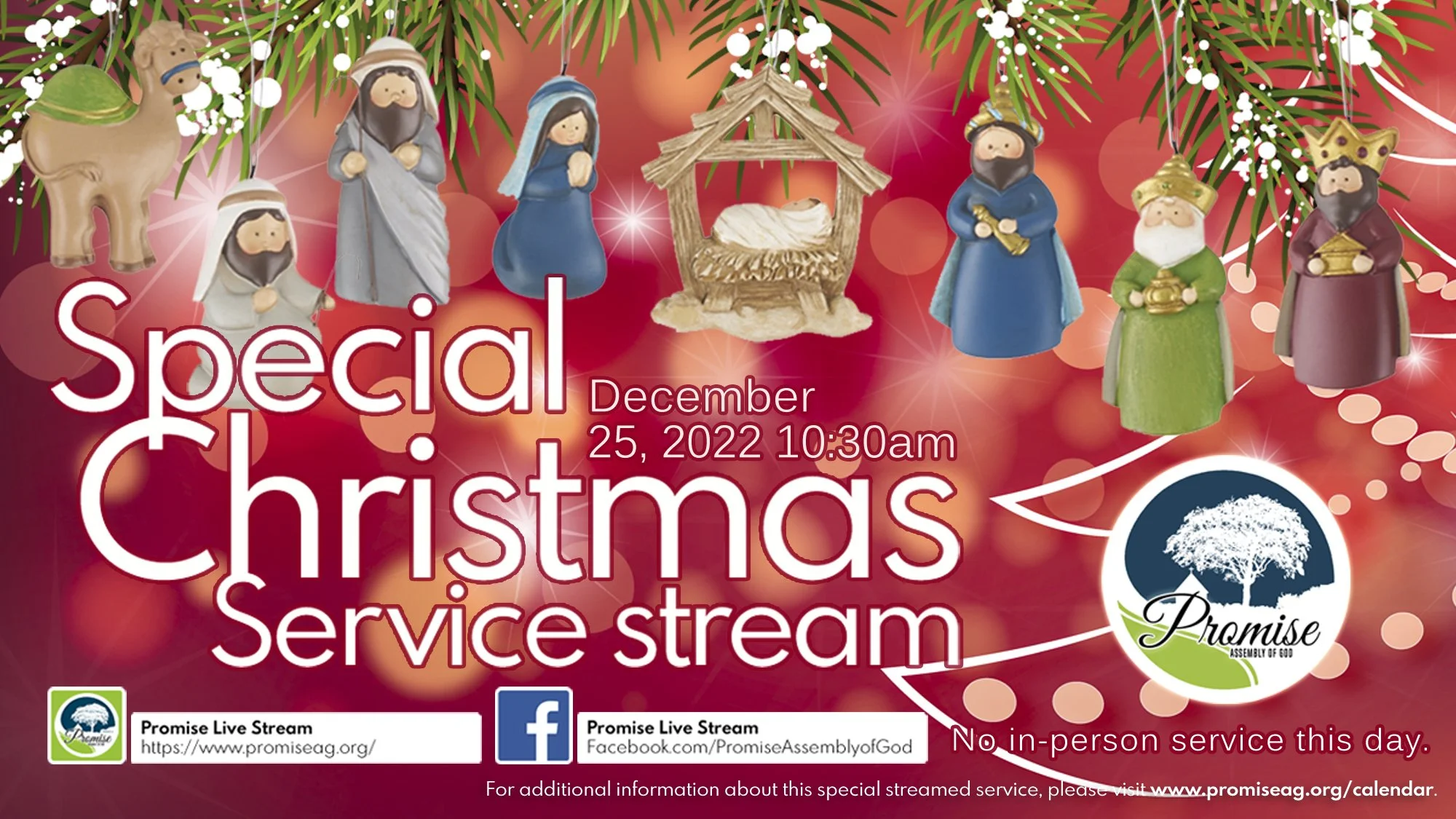A Special Christmas Morning Service stream will be shared through streaming at www.promiseag.org. Additional stream feed available at Promise AG Facebook https://www.facebook.com/pg/PromiseAssemblyofGod/. This special stream will begin at 10:15am. Invite a friend and come prepared to celebrate the birth of our Savior. Note: In-person service will not occur on Sunday 12/25/2022.