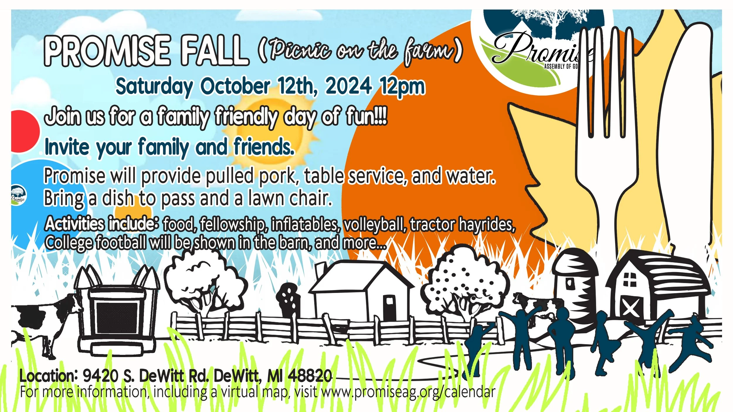 Please join us Saturday, October 12th, for our Promise Fall (Picnic on the farm)! Activities will include food, fellowship, giant inflatables, volleyball, tractor hayrides, lawn games and all the fun you can imagine. DON’T WORRY… college football will be on in the barn! Promise will provide delicious pulled pork sandwiches, table service and bottled water. Please bring a lawn chair, dish to share, a drink if you would like and you, your friends and family! (There will be tables for lunch seating in the barn.) Please RSVP on the Facebook event, church sign-up or to Amanda at (517) 290-9615 to help with food preparations. We simply can’t wait to see you!