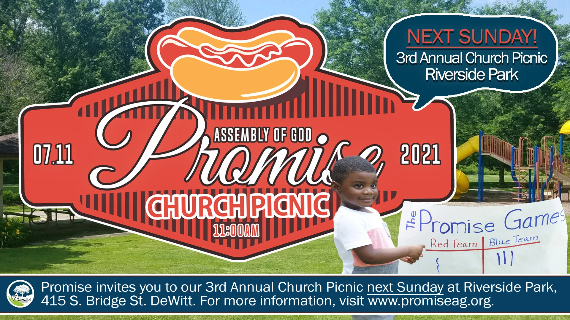 Please join Promise Assembly for our 3rd Annual Church Picnic at Riverside Park 415 S Bridge St DeWitt, MI 48820. The picnic will begin at 11:00am. Invite a friend and come prepared to eat and socialize together. Meat, table supplies, and water will be provided by Promise AG. Please bring a side dish to pass along with any special drinks and any other special items. Yard games will be set up for a great time of fun and relaxation.